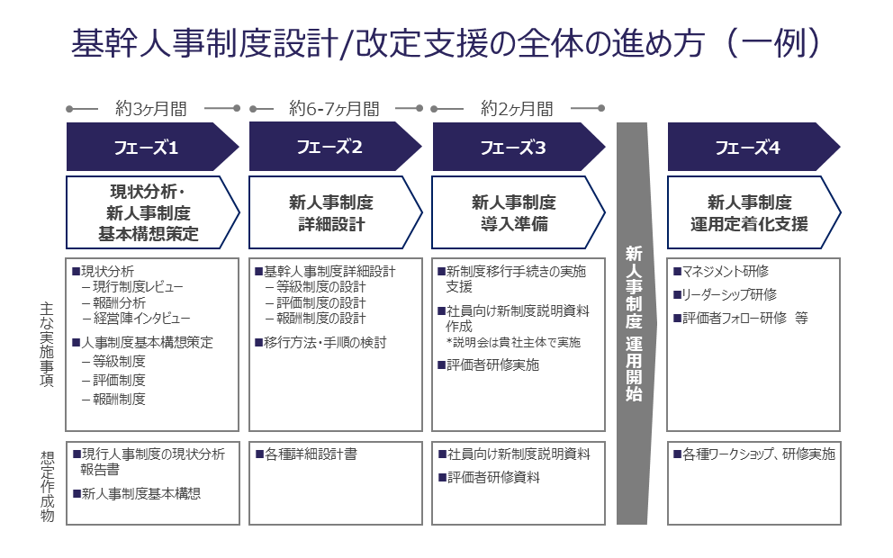 当社では、基幹人事制度設計/改定を成功に導くため、現状分析から運用定着化までの一貫した支援体制を提供します。