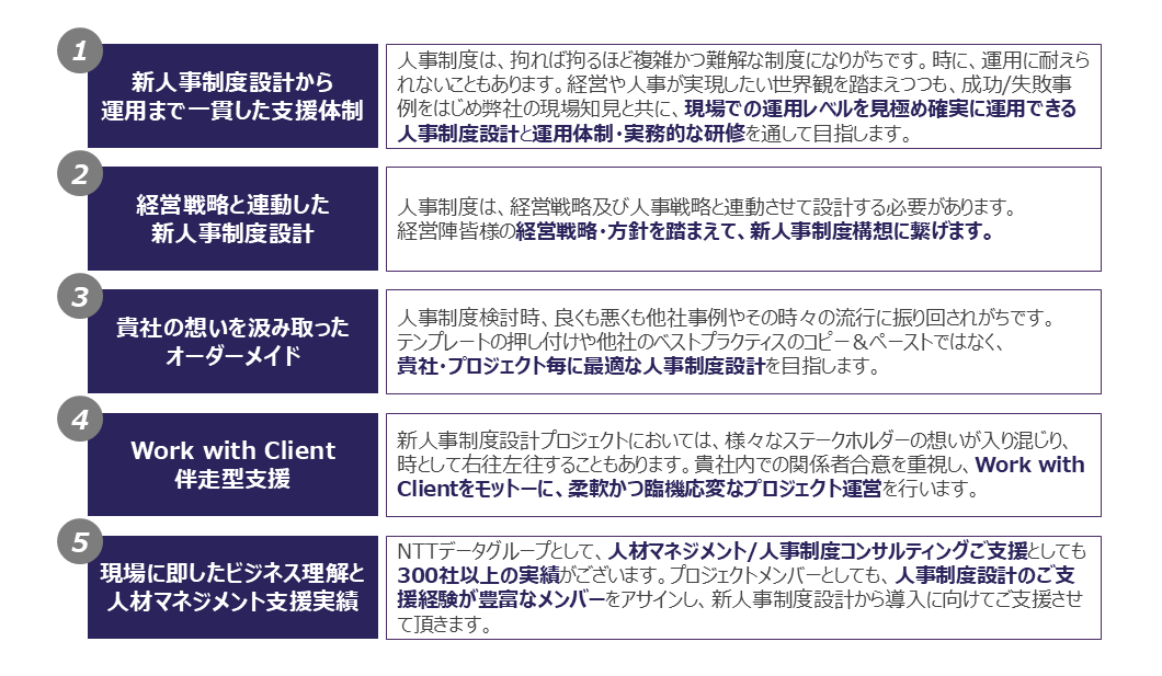 当社は、これまでで累計300社以上と数多くの企業の人材マネジメント/人事制度コンサルティングに取り組んで参りました。豊富なコンサルティング実績をもとに培ったフォーティエンス流基幹人事制度設計/改定支援の強みは、以下の5つです(図2)。