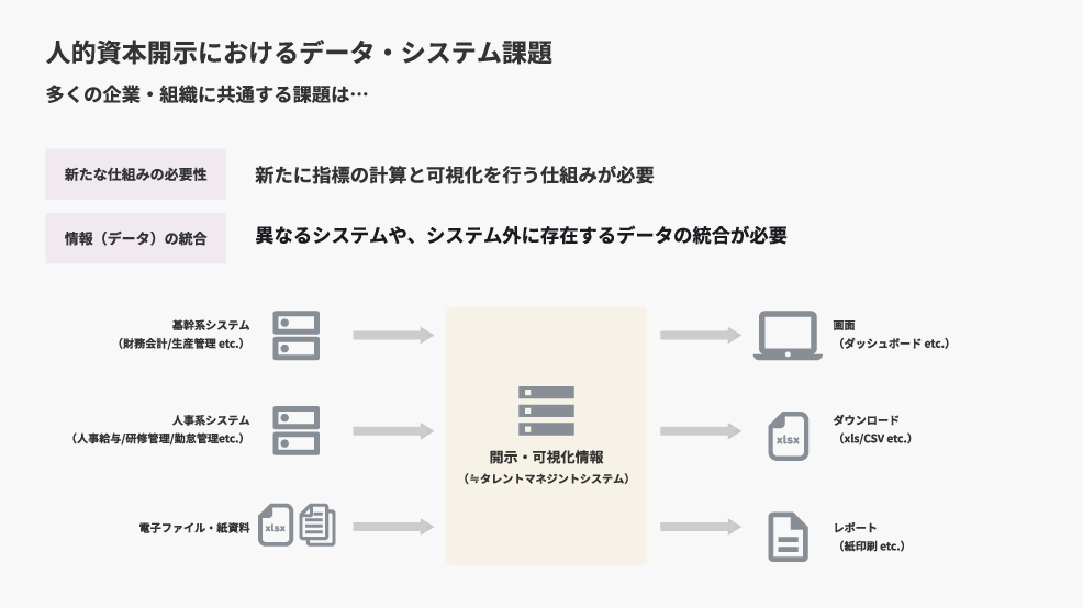 人的資本開示に向けた取り組みでは、往々にして経営との合意形成や施策の立案、情報マネジメント基盤の整備に時間がかかることが、実践上の課題となっている企業が多く、課題解決に向けた即効性のある具体的なシステム導入のツールが求められています。(図1)