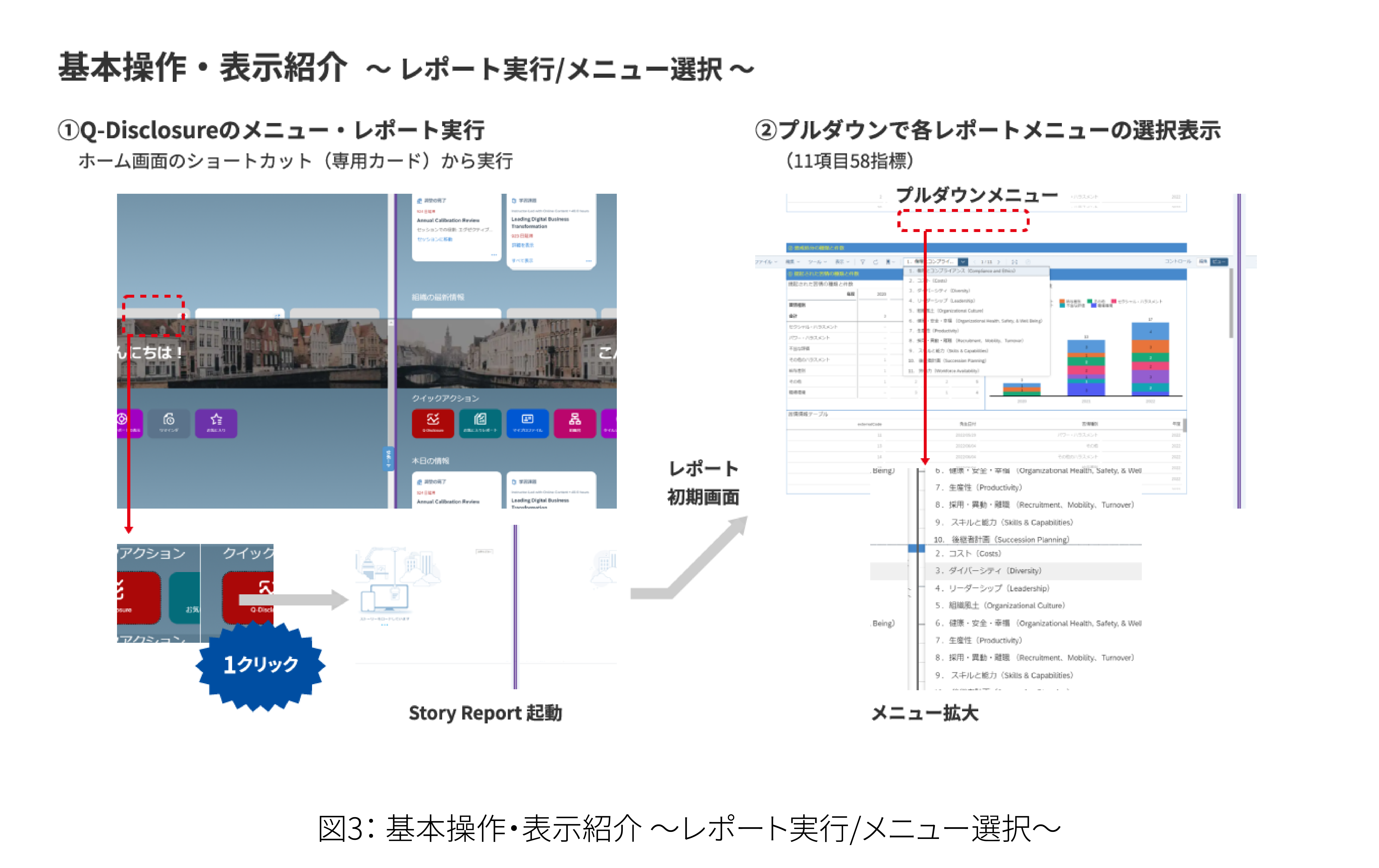 テンプレートは特定の機能モジュールではなく、一つの大きなStory Report(標準レポート)群で、各指標毎のレポートを実行する形式となります。指標はISO30414の「11項目58指標」および政府可視化指針推奨指標に準拠しており、このテンプレートの標準設定を個社の環境に合わせて移行し、調整を行うことで導入後直ちに全ての指標を集計された表とグラフのレポート形式で表示可能です。(図3)