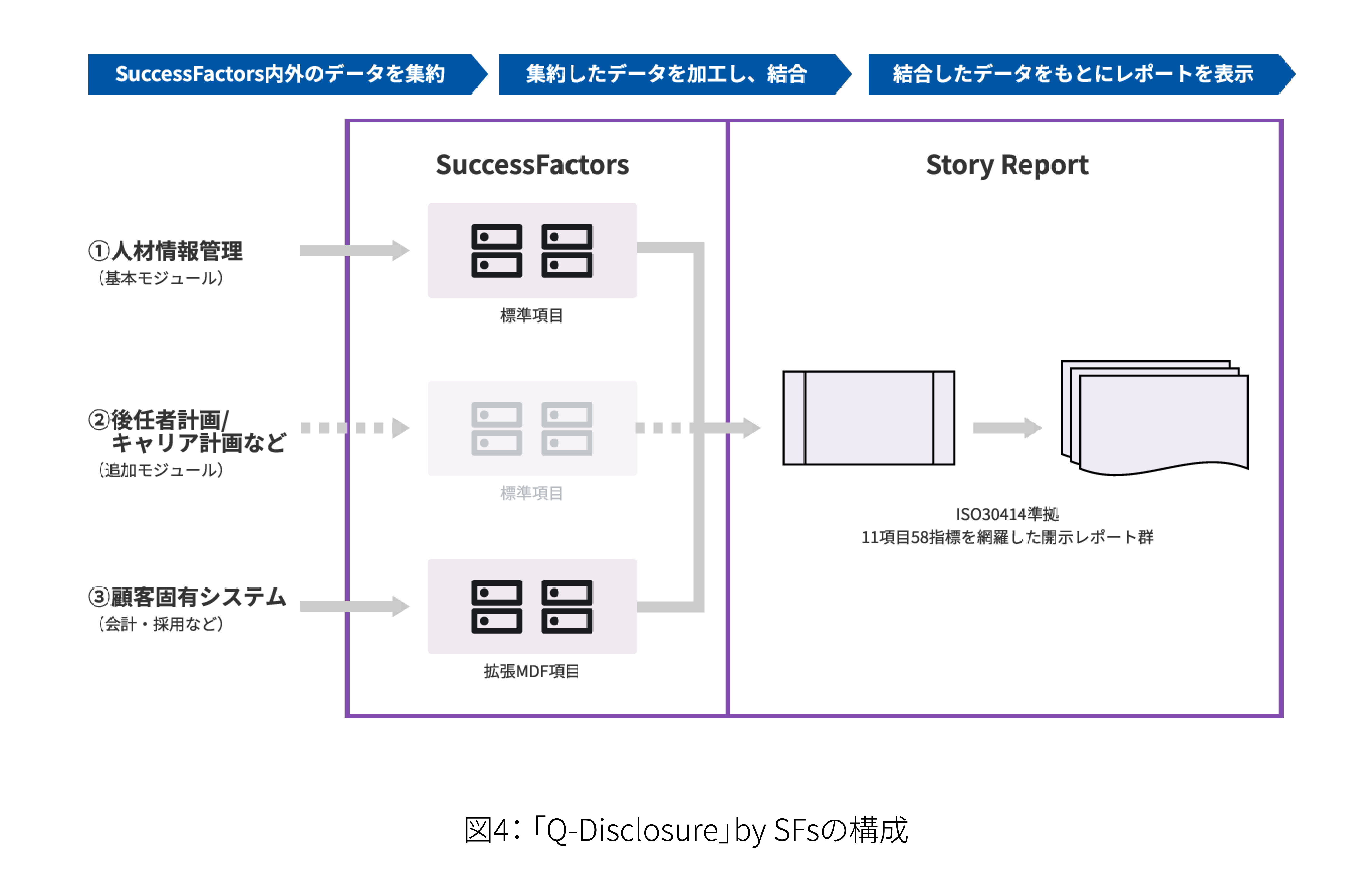 上記のように、「Q-Disclosure」by SFsはISO30414および政府可視化指針推奨指標基準に則った人的資本開示レポートに必要なデータを前提とし設計しているため、外部データのSAP SuccessFactorsへの連携のみ準備することで、部門間・システム間での調整や運用の大幅な効率化が実現可能です。