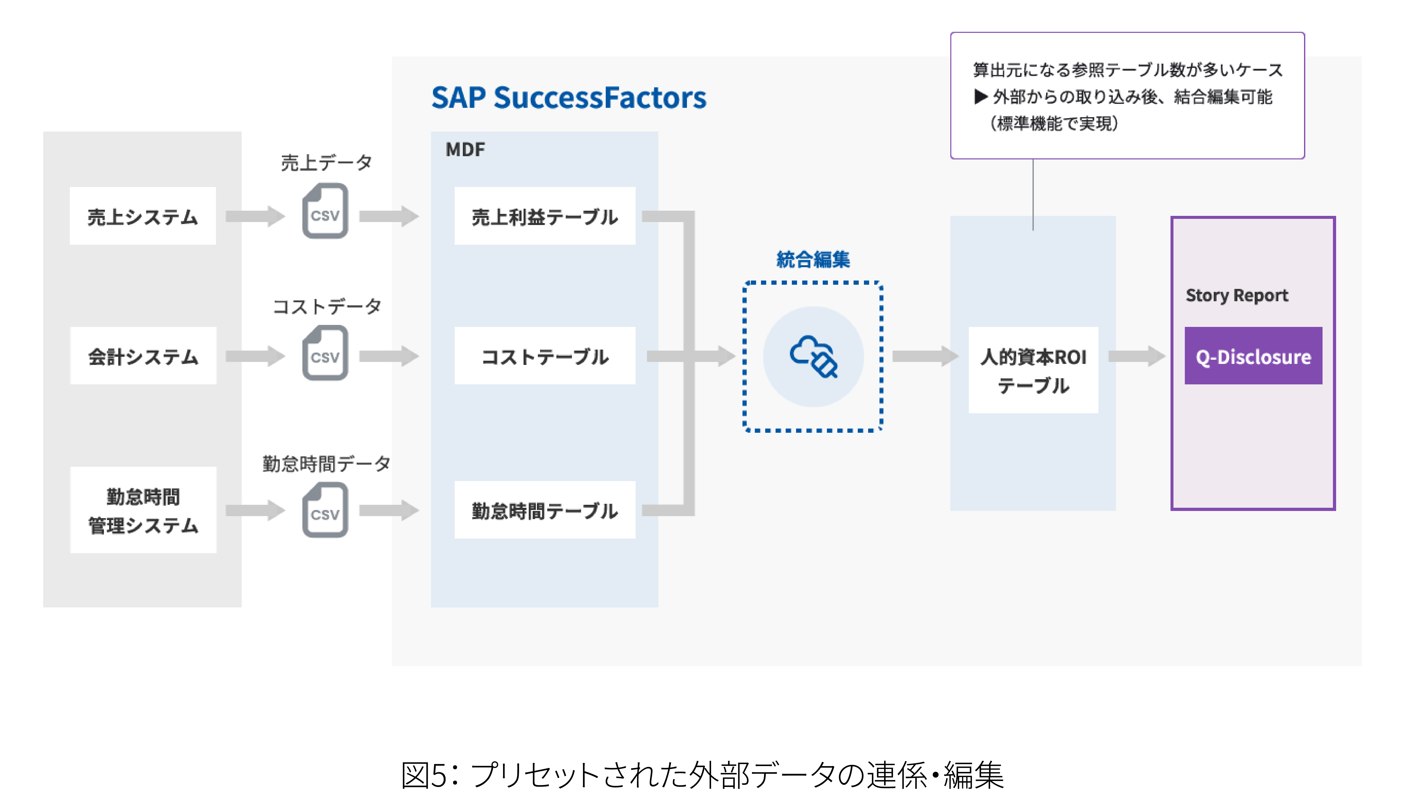複雑な計算を要するレポートでは、計算の基になる数値をまとめて用意し利用する仕掛けが必要になります。(図4)「Q-Disclosure」by SFsでは源泉となる外部データ等をSAP SuccessFactors内に取り込み格納するテーブル(MDF)がプリセットされており、これらのテーブルをファイル連携の標準ツールを活用し、一つの複合要素のテーブルを生成することで指標算出の全自動化を実現しています。(図5)