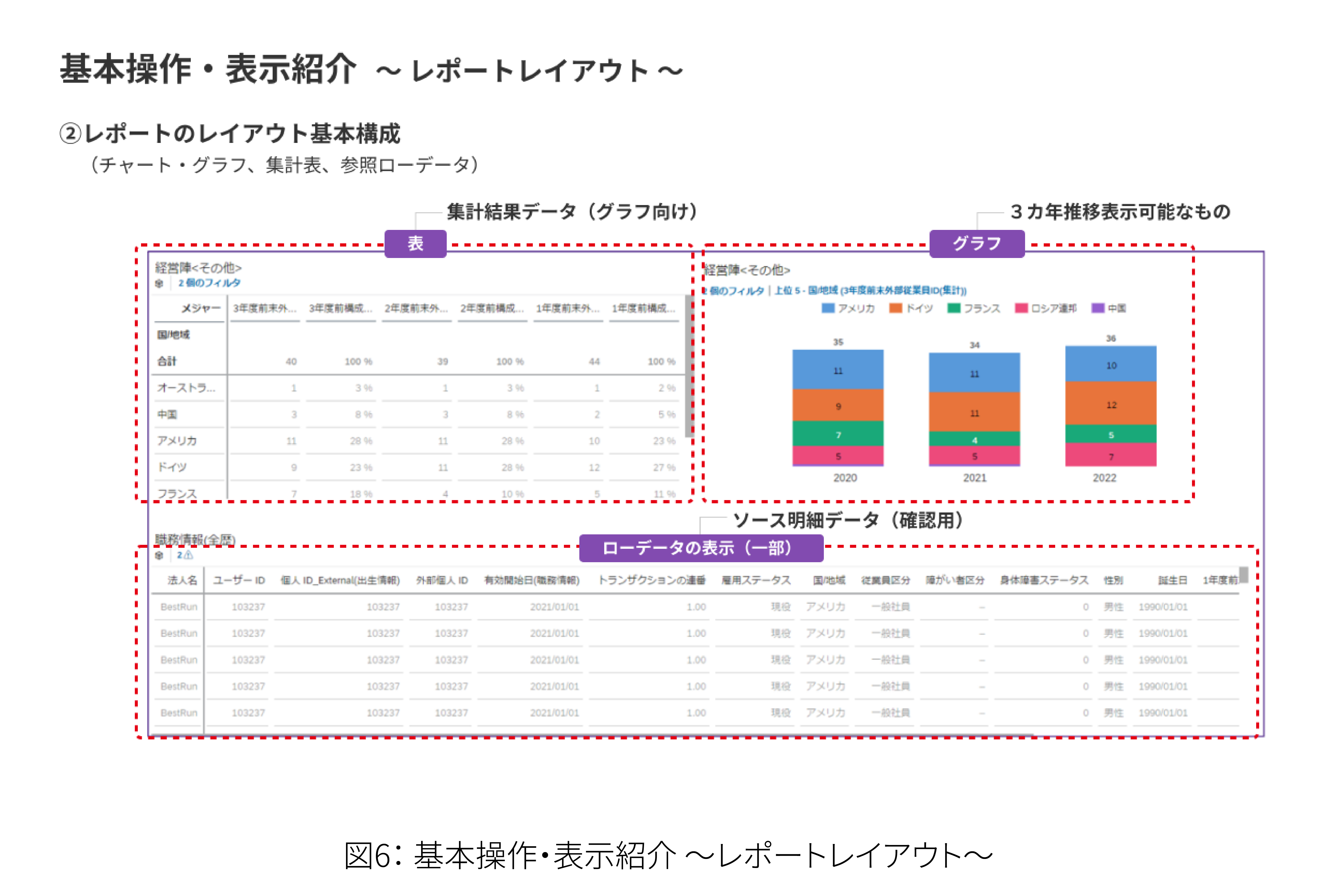 画面のレイアウトは「表」、「グラフ」及び「ローデータ」を標準としており、一瞥して状況を把握できることをコンセプトとしています。「表」はISO30414および政府可視化指針推奨指標に合わせ、加工、集計しており、「グラフ」は集計された表データを基に3か年の経年変化を一目で分かるようにすることで取り組みの「道のり」が把握できます。(図6)