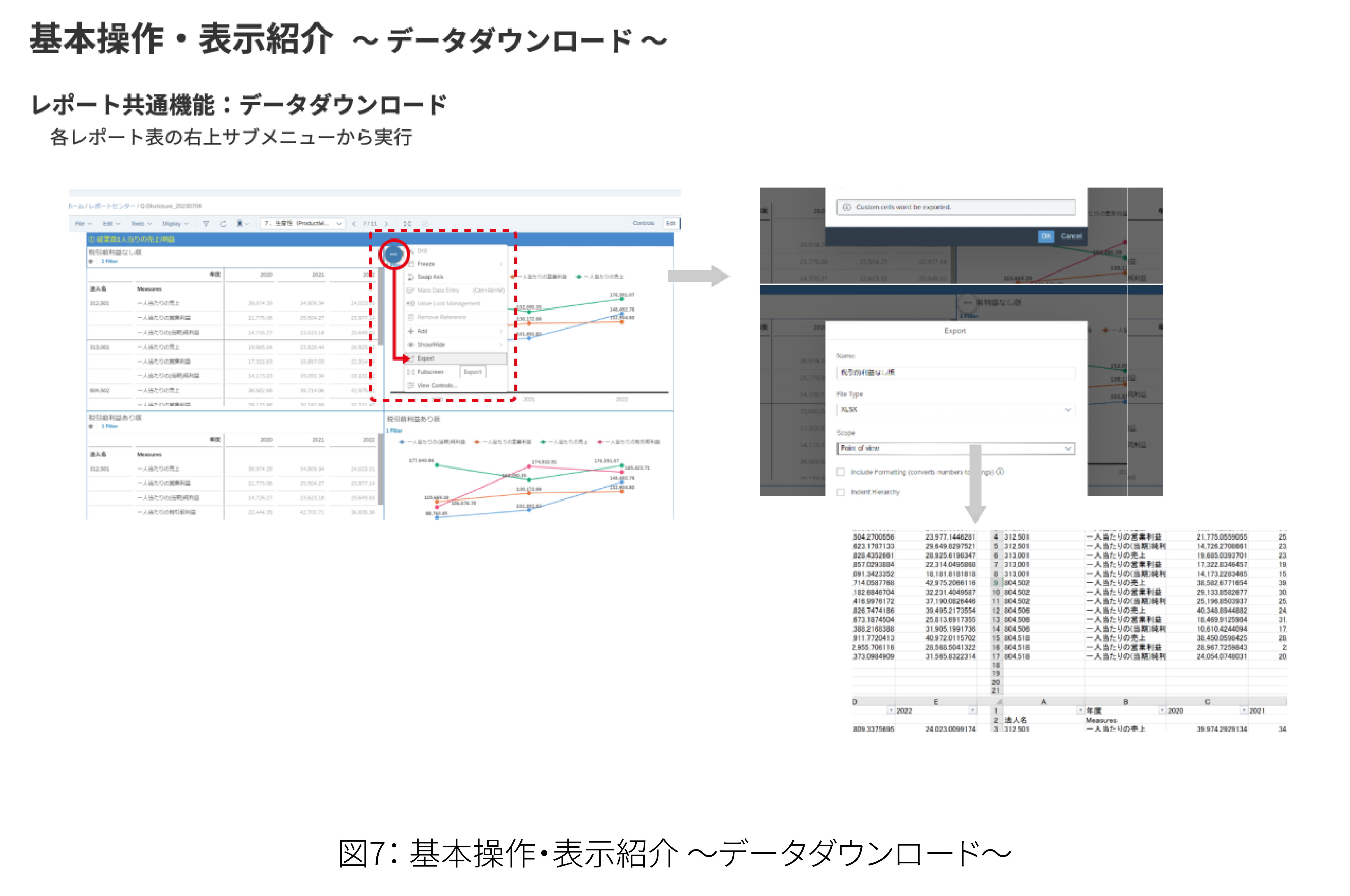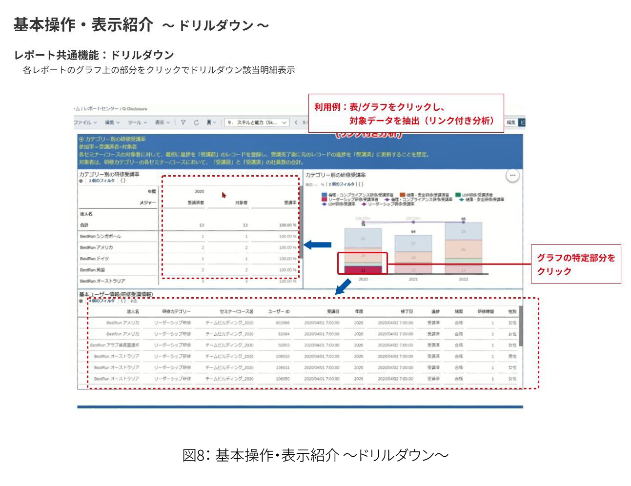シンプルなテーブル群からなる集約・一元管理された即時性の高い情報を活用し、新たなレポートを追加・アレンジすることで、情報の分析・活用のメリットを広く享受することが可能です。また集計及びローデータ表からのダウンロードによる二次データ利用(図7)や、画面上でのフィルタで組織など表示内容の切替や、グラフからの注目点のドリルダウン(図8)などの分析的操作も可能なことから、社内でのツールとしての応用・活用範囲も広がります。