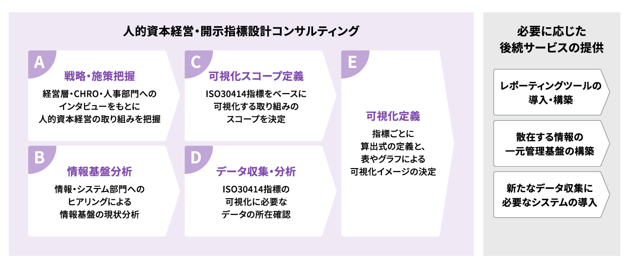 人的資本情報開示のガイドラインであるISO30414の指標をもとに網羅性を担保します。
