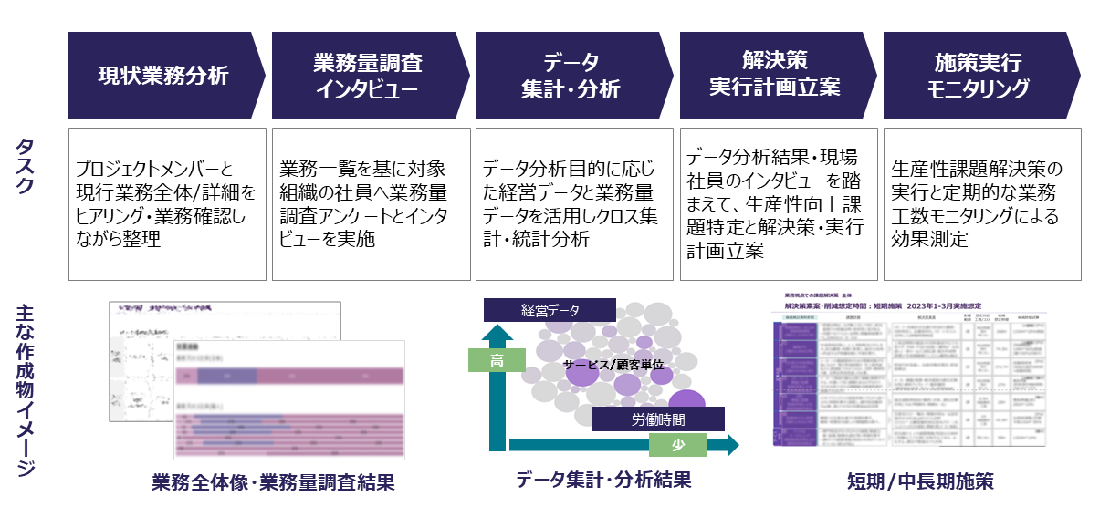 当社では、現状業務分析、業務量調査・インタビューを通して事業現場のリアルな実態を可視化することに加え、調査した業務量・要員稼働情報に、商品/顧客別の売上/利益や品質に係る経営情報を掛け合わせて分析することで、生産性改善に資する示唆を創出します。それにより、顧客ポートフォリオ転換や組織機能変革、従業員の戦略/企画業務への工数捻出をはじめとした変革のロードマップを描きます。目指す姿を明確にした上で、現場の従業員と連携し、成果創出できる施策を素早く実行すると共に、統制/モニタリングまで一気通貫で支援します。