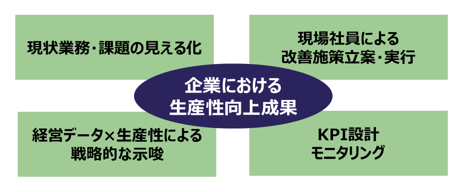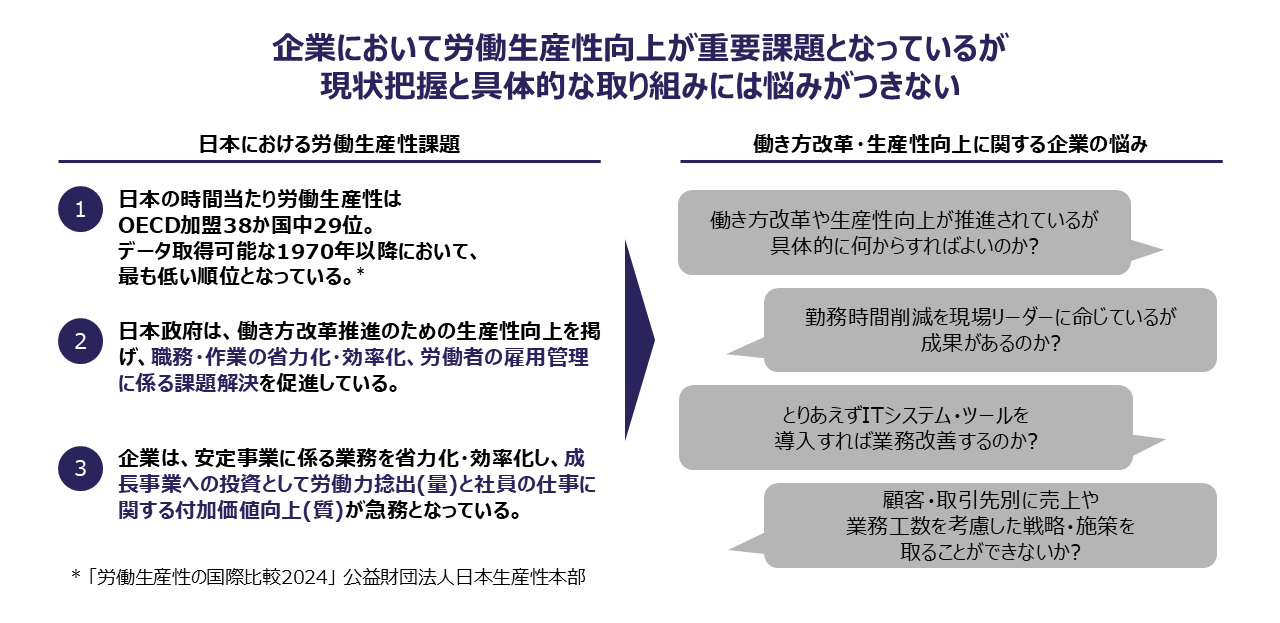 人口減少・少子高齢化に伴う人手不足が深刻化する中、日本政府の働き方改革推進や生成AI活用による業務高度化・効率化が普及しており、日本企業では生産性向上の取り組みが重要になっています。時間当たり労働生産性が国際比較でも低い日本の持続的な成長のためには、日本企業が事業現場で業務効率化・高度化に着手することが必要です。安定事業に係る業務を省力化・効率化し、成長事業への投資として労働力捻出(量)と社員の付加価値向上(質)が急務となります。しかし、経営層や従業員は、何が課題で具体的にどのように取り組みすれば良いか分からず、成果創出まで繋がらないという悩みを抱えることもあります。