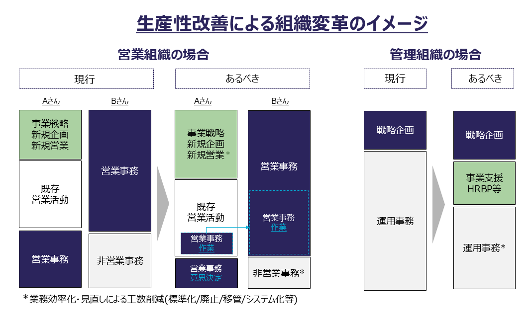 経営・事業戦略実現のための組織人事施策として、日本企業にも生産性向上による労働力捻出と付加価値向上が求められています。その課題解決を支援する本サービスは、現状業務分析・業務量調査およびインタビューを行い、事業現場のリアルな実態を可視化します。経営・管理職と現場との検討を踏まえ、目指すべき組織の状態を定義し、そのために必要な短期/中長期の改善施策と実行計画を立案します。立案した計画が絵に描いた餅にならないよう、豊富なコンサルティング実績をもとに、現場の従業員と連携してすぐに実行・成果創出するまで一気通貫で支援します。