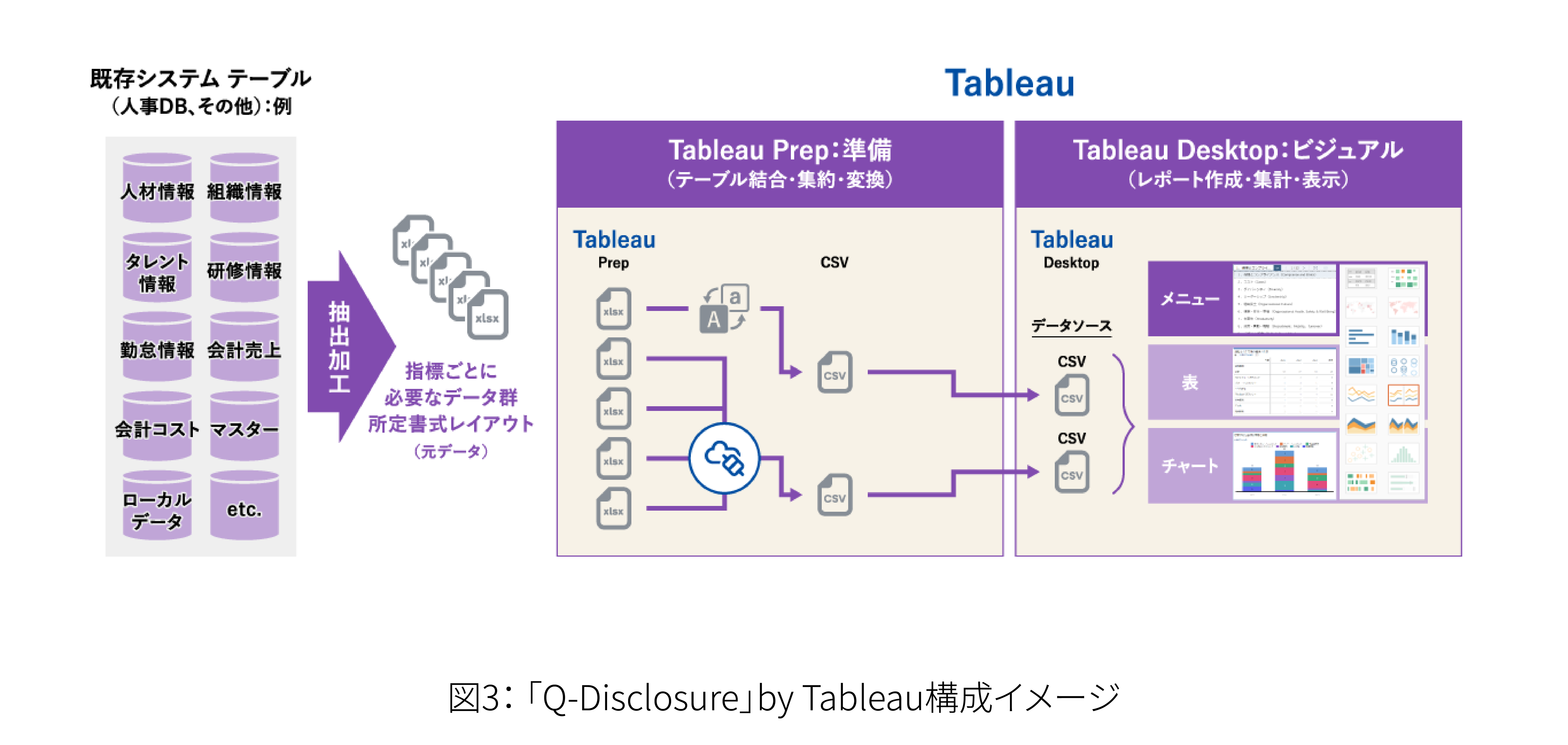 フォーティエンスの人的資本開示テンプレート「Q-Disclosure」by Tableauは、汎用分析BIツールとしてメジャーかつ操作性の高いツールである「Tableau」での活用を前提に設定されており、本テンプレートの既存設定をお客さま企業の環境に合せて移植・調整することで設定後、直ちに人的資本開示対応が可能となります。(図3)