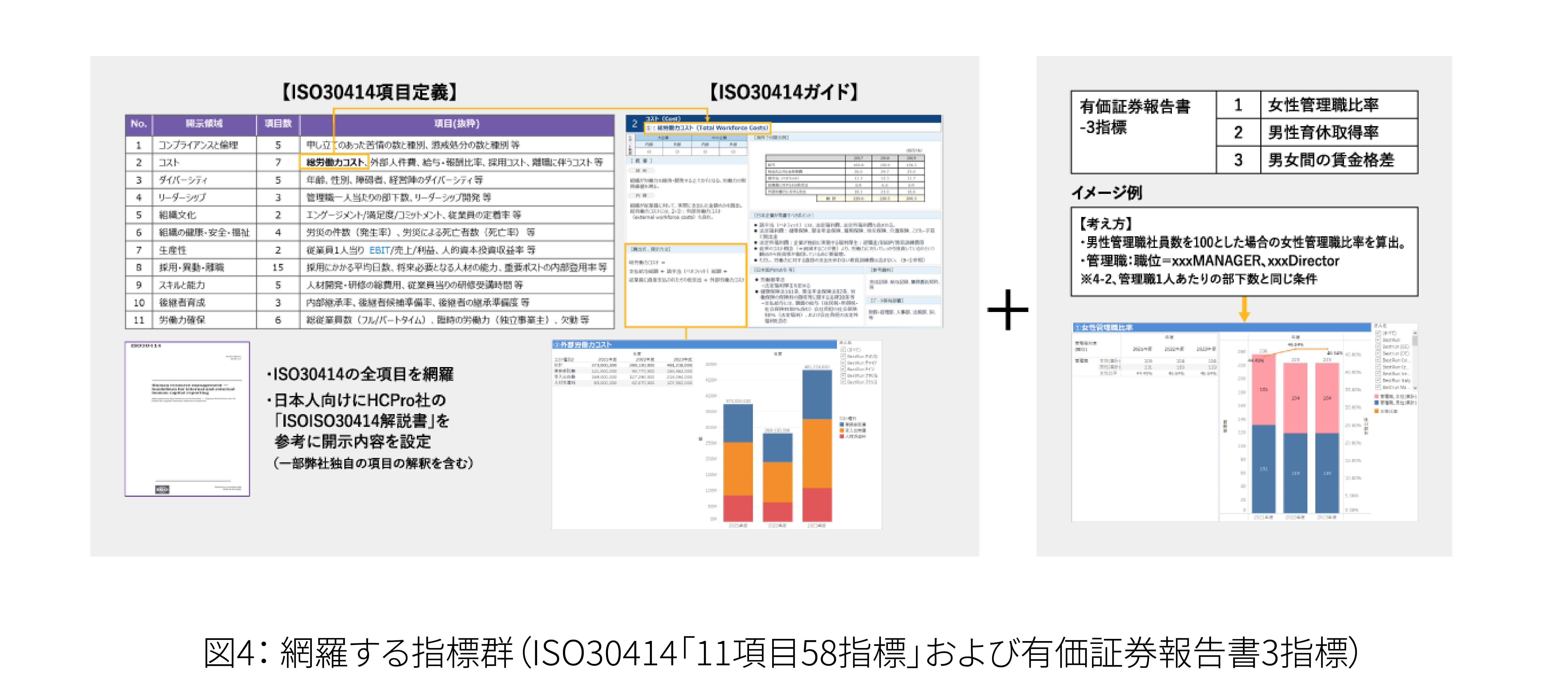 また、ISO30414の11項目58指標および有価証券報告書3指標に準拠していることから、導入後直ちに全ての指標を集計した表やグラフをレポート形式で表示することができます。(図4)