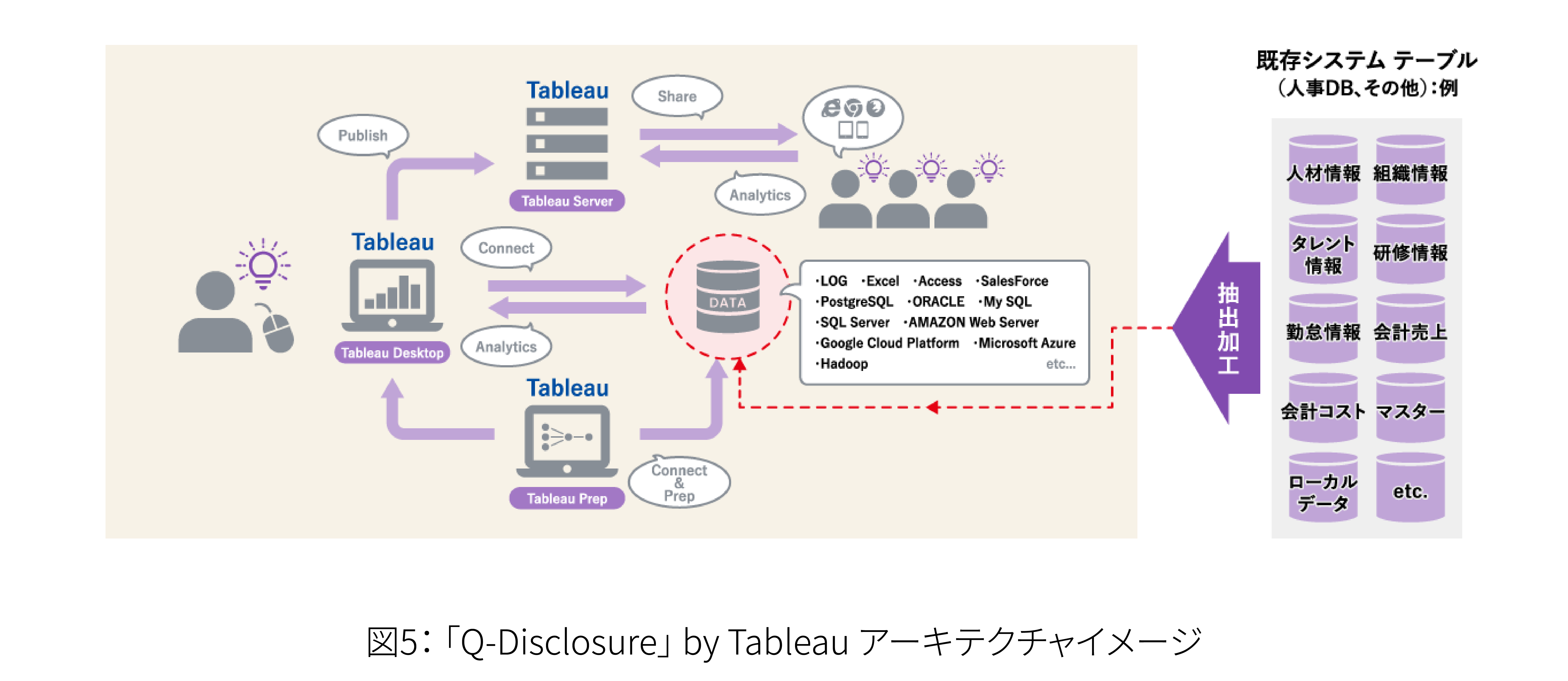 「Q-Disclosure」 by Tableauでは、外部データ等を汎用的な複合CSV形式で連携するため、人的資本の各種基礎データを格納するための情報マネジメントシステム基盤は不要です。(図5)