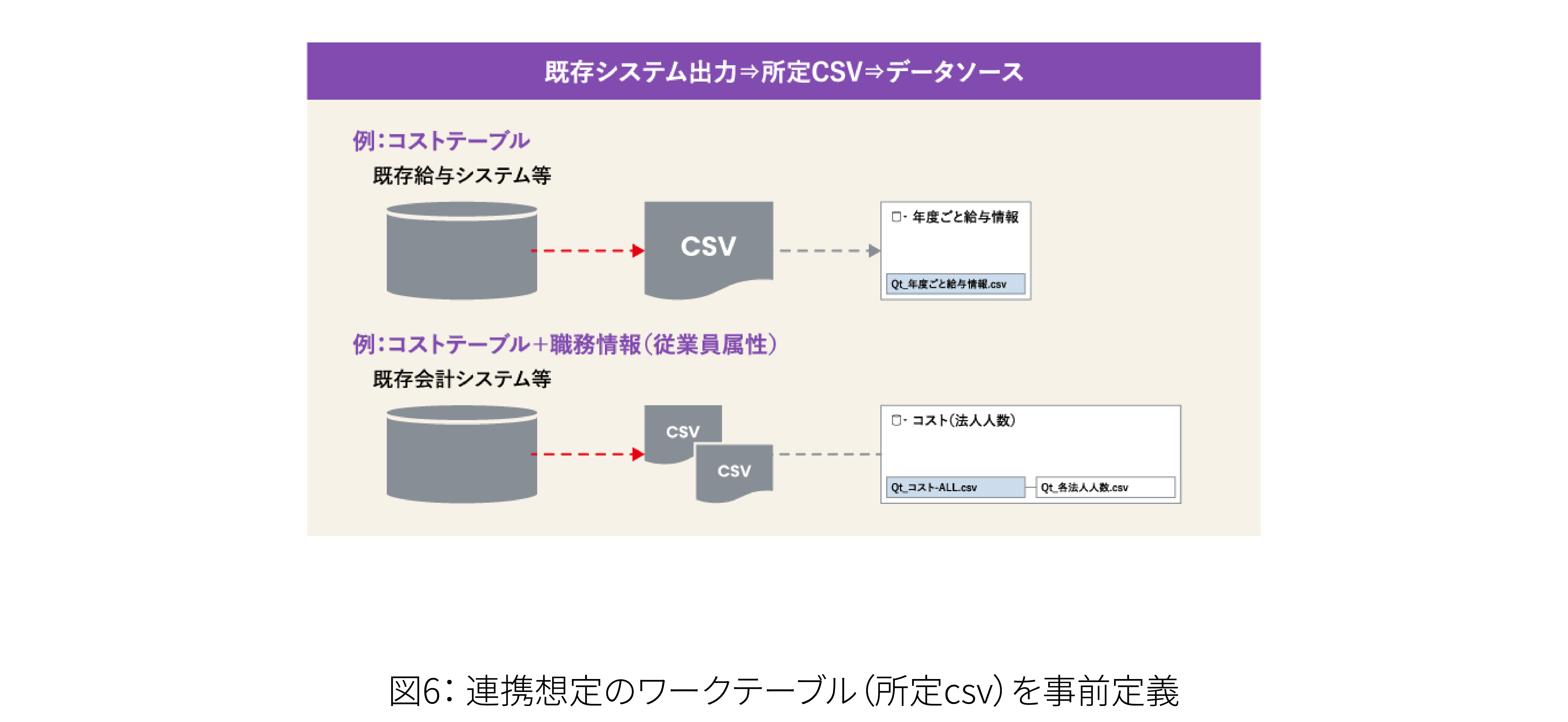 また顧客固有システムとの連携想定のワークテーブル(所定書式csv)を事前定義済みのため、人事以外の会計システムやその他外部システム等との連携も容易に実現が可能であること、データ管理のための既存システムのライセンス追加費用も不要といったことなどから、コスト面でもメリットが見込まれます。(図6)