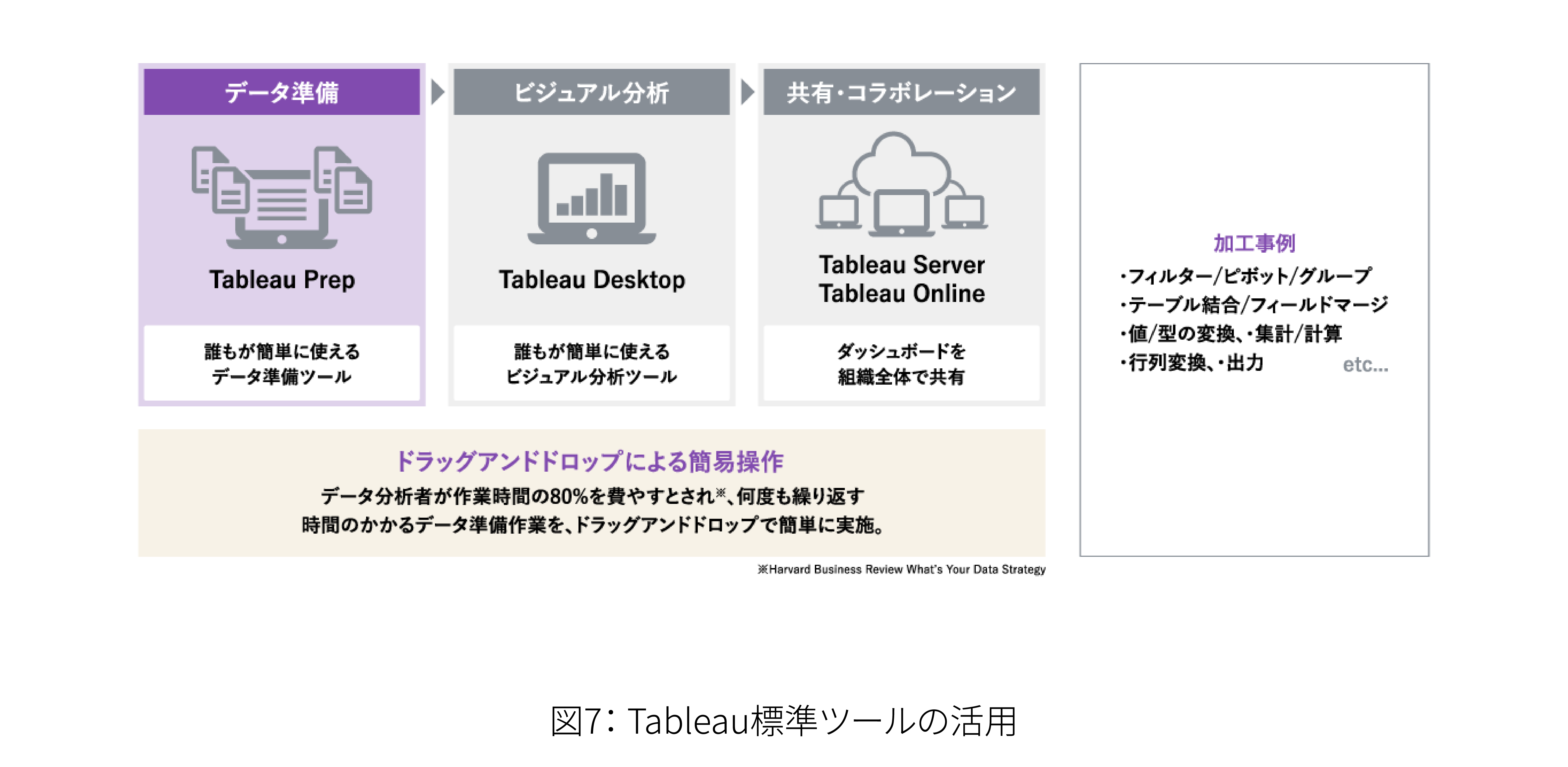 「Q-Disclosure」 by Tableauでは、Tableau Prep(既存システムから素データ出力後のデータの事前加工(準備)ができるデータクリーニングツール)を活用し、データの更新時期(追加、洗い替え等)に定型処理を予め定義しておくことで、実行処理のみが可能となります。(図7)
