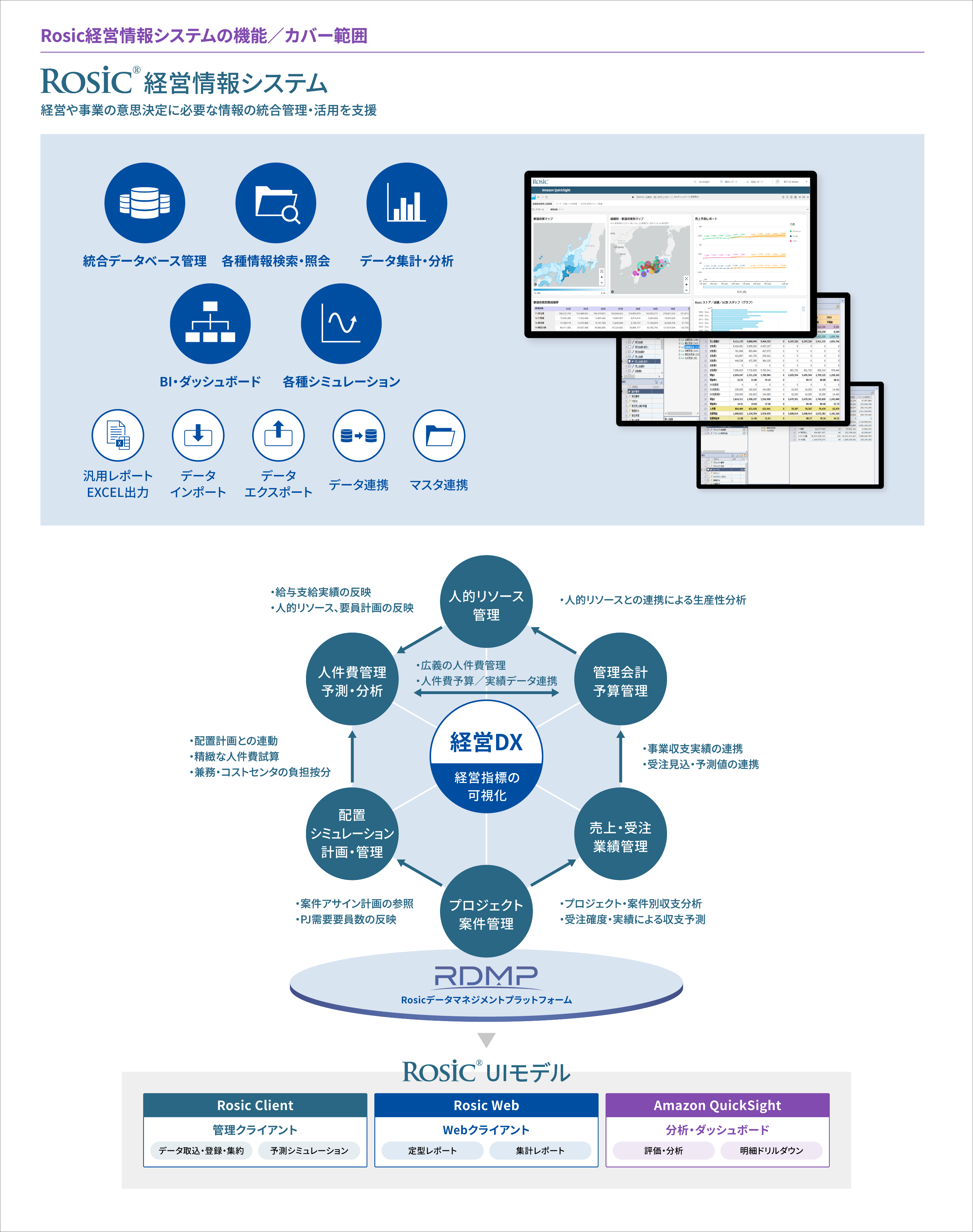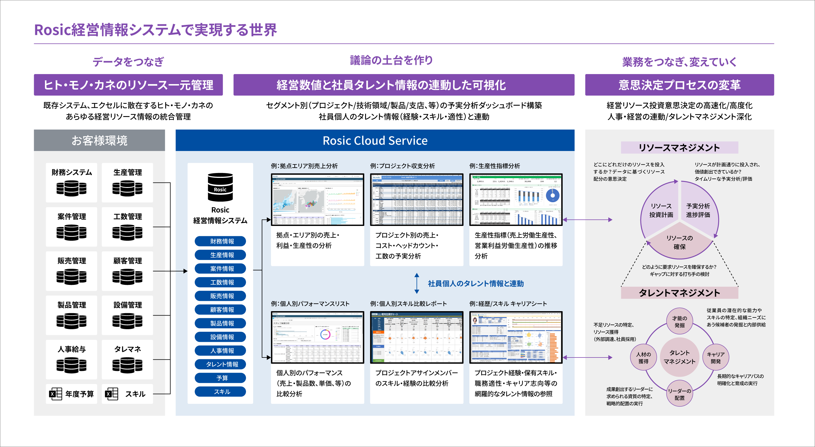 Rosic経営情報システムは、経営リソース統合・可視化基盤として以下の強みを有しています。