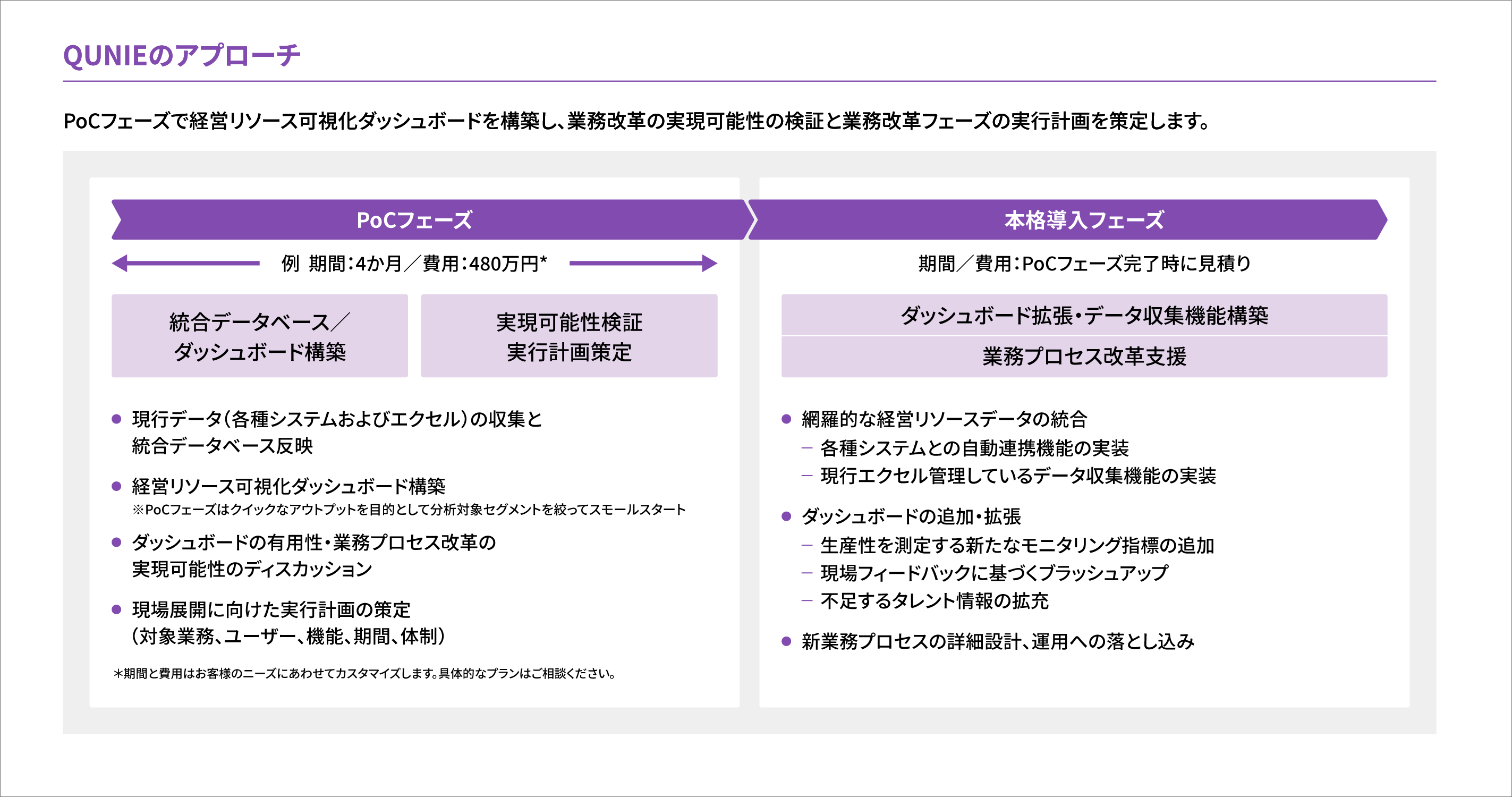 本格導入前に、経営リソース可視化による業務インパクトを検証するためのPoCフェーズを設定します。