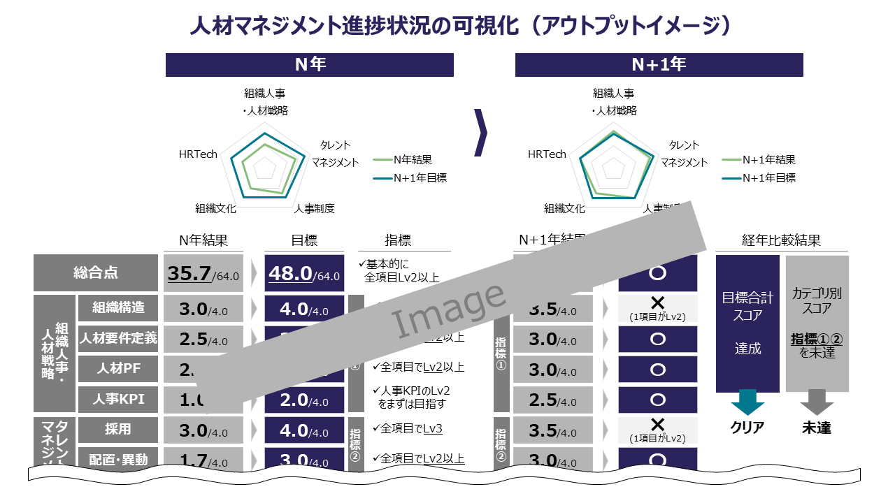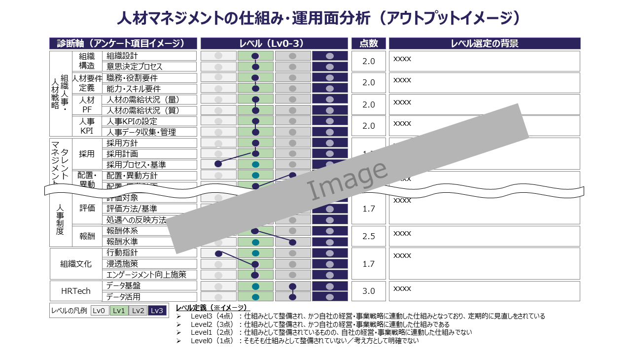 経営戦略と人材戦略の連動性や、人材マネジメントにおける採用・配置・育成・等級・評価・報酬などの各カテゴリーに対する仕組み面、等級・評価・報酬など人事制度の運用面で正しく機能しているかを定量的に評価します。